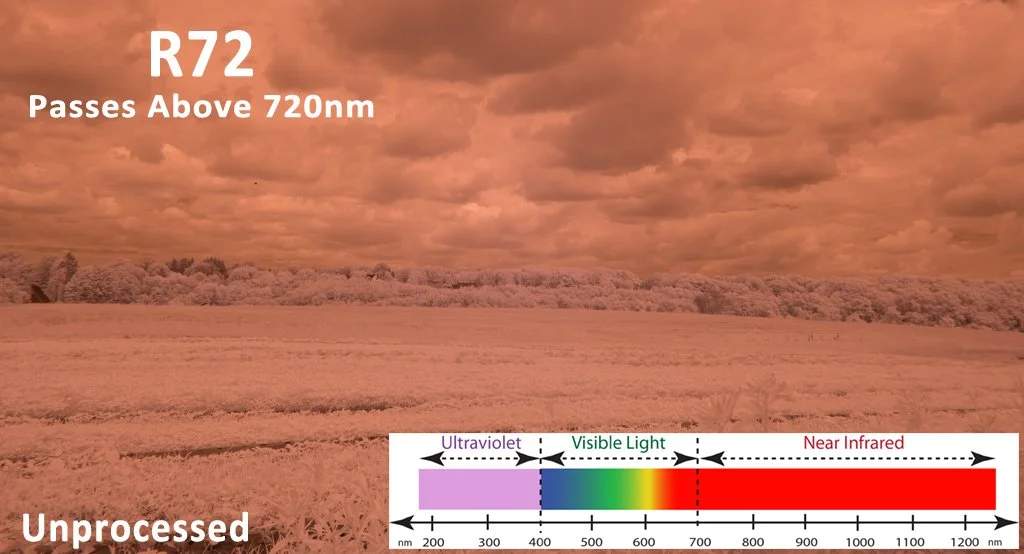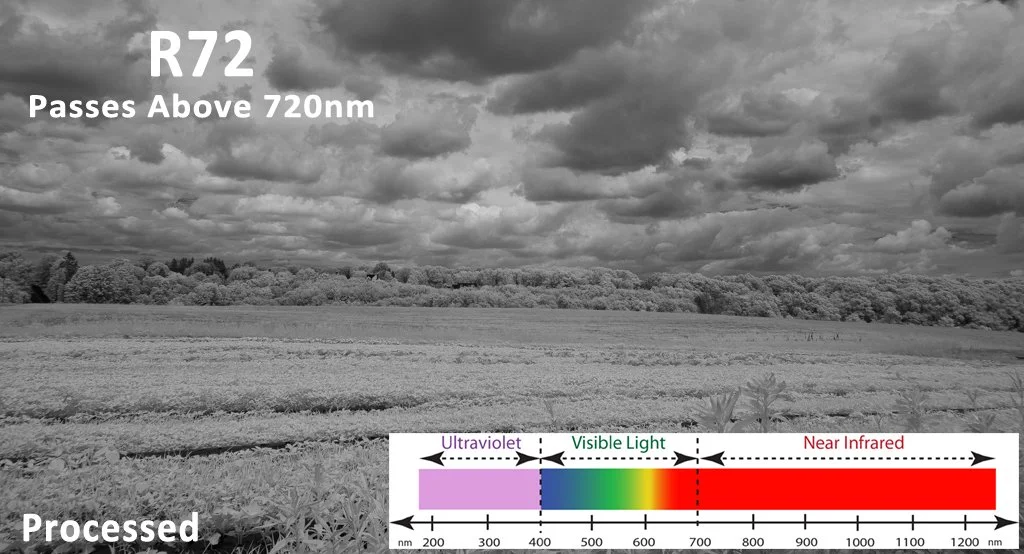 The R72 filter essentially cuts off almost all of the visible spectrum, passing the radiation spectrum of the near infrared portion of the spectrum from 720 nanometers to its upper limit of 1100 nanometers, depending on the design of the sensor.