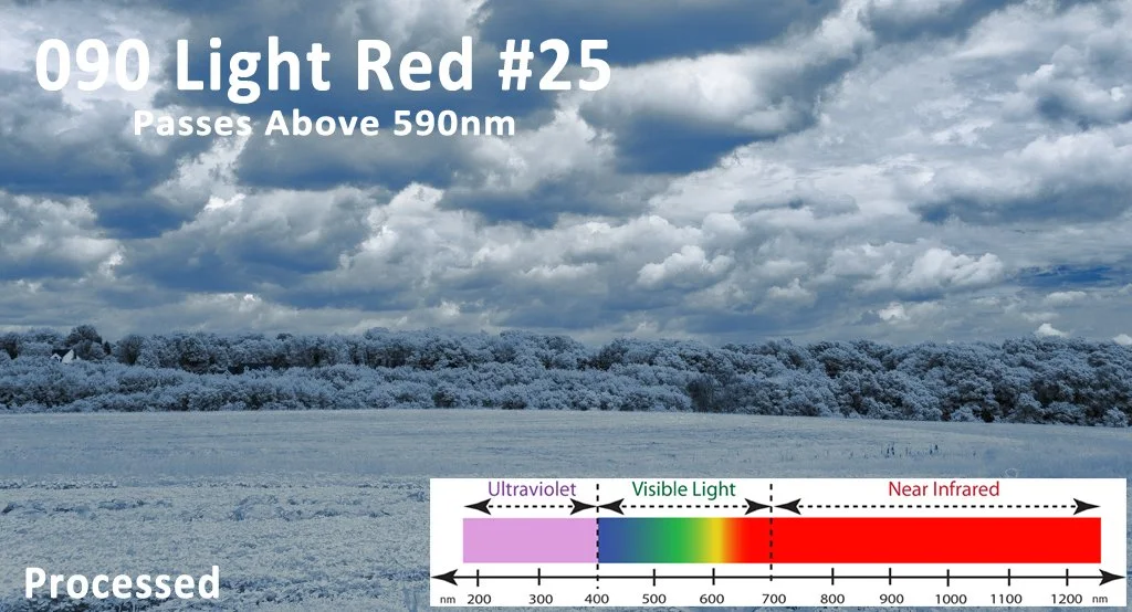 The 590nm filter, typically referred to as "090 Light Red #25" allows almost the entire red portion of the visible spectrum to pass to the camera sensor, and is reaching close to the yellow area of the spectrum.