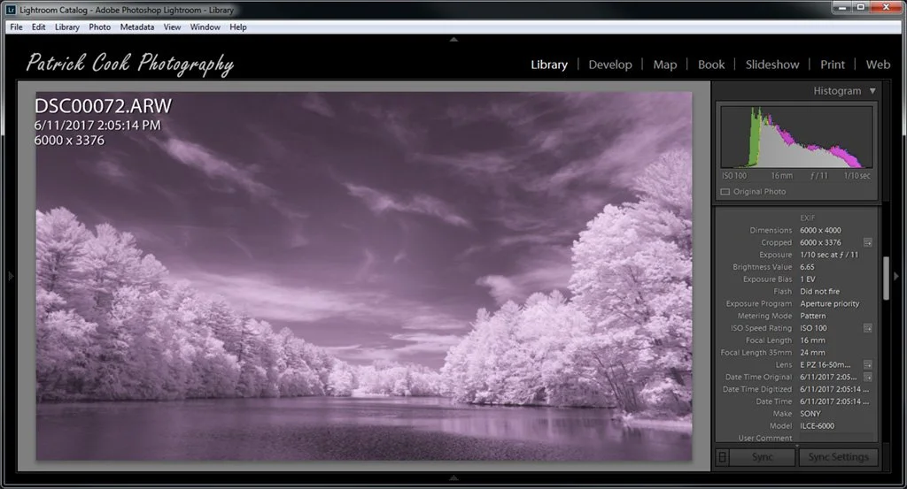 Now, what about color? As can be seen by the histogram of this image being shown in Lightroom, the image still has color information in all of its color channels. That's because the camera that was filtered to record in the near infrared spectrum still functions as a color camera. This example image was taken with an 830 nanometer lens mounted filter on a Sony a6000 converted for full spectrum. The 830 nanometer filter blocks all of the visible spectrum. Yet the camera is still trying to encode color information just as it was designed to do.